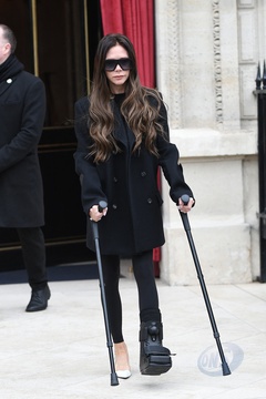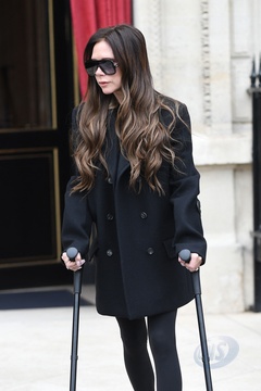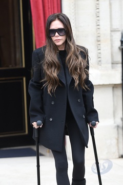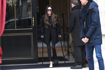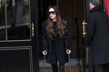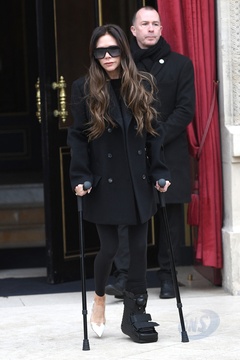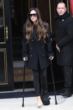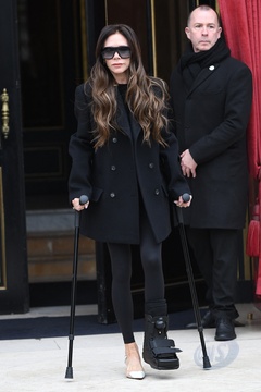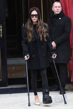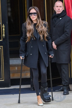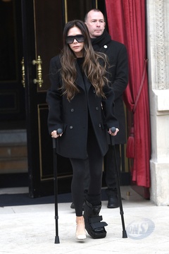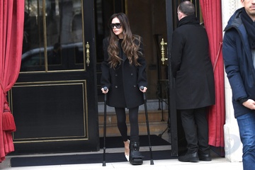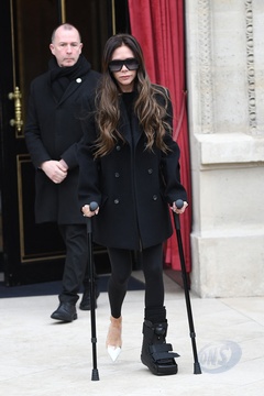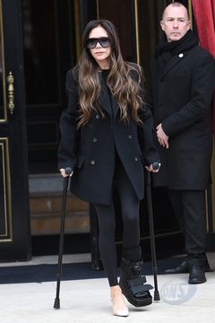 Victoria Beckham, blessée au pied gauche, sort du restaurant La réserve avec ses béquilles en marge de la fashion week femme automne/hiver 2024-2025 à Paris (PFW)