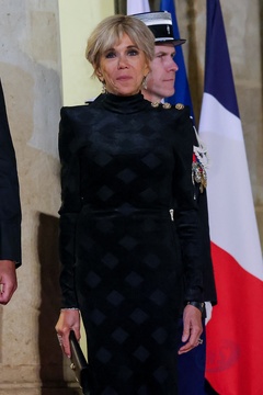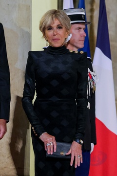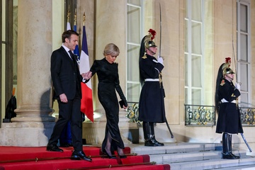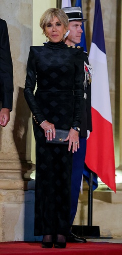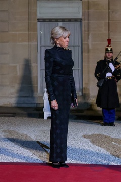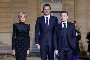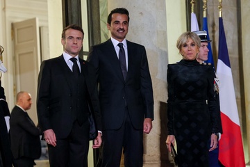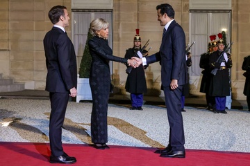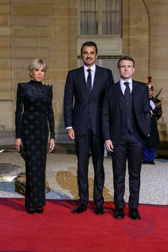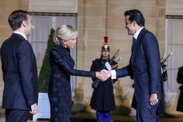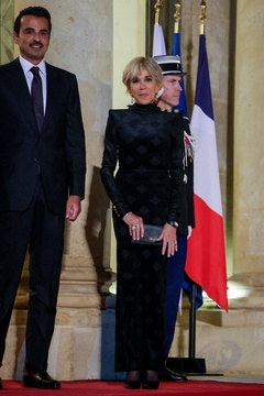 Emmanuel Macron i jego żona Pierwsza Dama Brigitte Macron witają w pałacu prezydenckim emira Kataru Jego Wysokość Szejka Tamima bin Hamada Al Thaniego 18