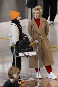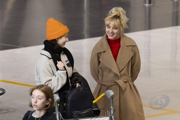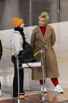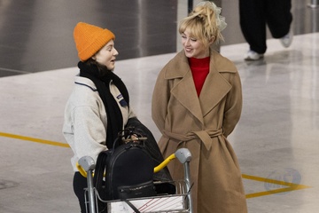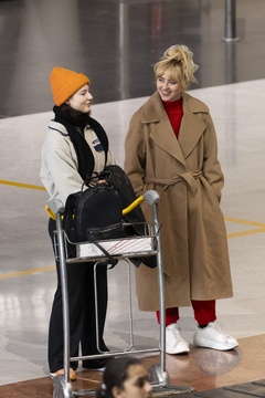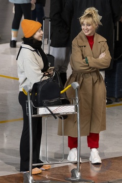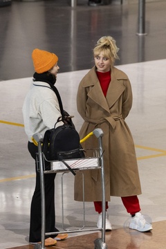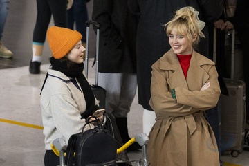 Exclusif - Kathryn Newton et Thomasin McKenzie se croisent et discutent à l'aéroport de Paris-Charles de Gaulle (CDG) lors de la semaine de la mode femme automne/hiver 2024-2025 (PFW)