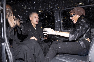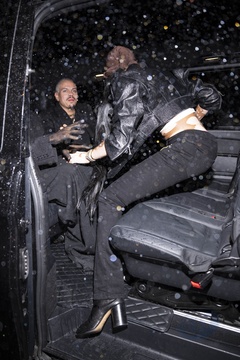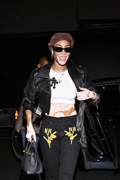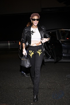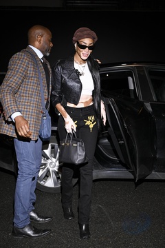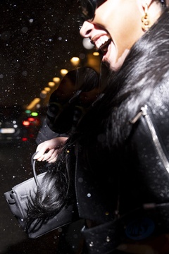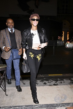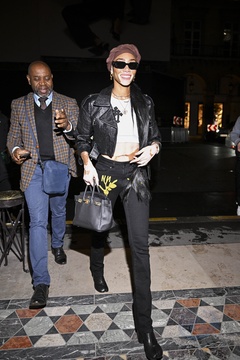 Winnie Harlow essaie d'esquiver la pluie à l'extérieur de l'hôtel Costes à Paris en marge de la fashion week (PFW)