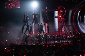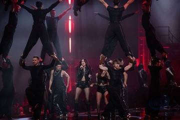 Dua Lipa performing live at the 2024 BRIT awards ceremony, O2 Arena, London, on 2 March 2024
