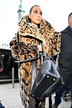 Kim Kardashian dans un manteau de fourrure à imprimé animal Balenciaga arrive à l'hôtel Ritz en marge de la mode femme automne / hiver 2024-2025 lors de la Fashion Week de Paris (PFW)