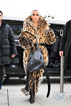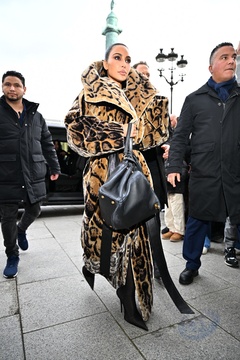 Kim Kardashian w futrze ze zwierzęcym nadrukiem Balenciaga pojawia się w hotelu Ritz na marginesie pokazu mody damskiej jesień/zima 2024-2025 podczas Tygodnia Mody w Paryżu 7