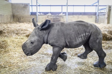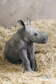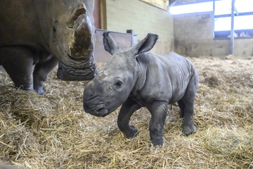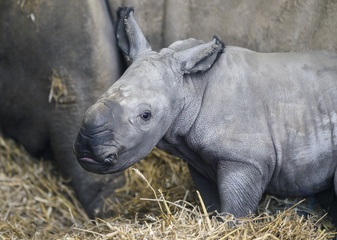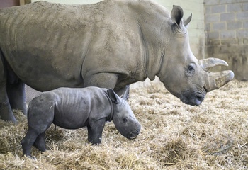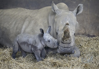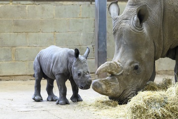 A four-day-old baby White Rhino pictured with its mother at Whipsnade Zoo, UK. P