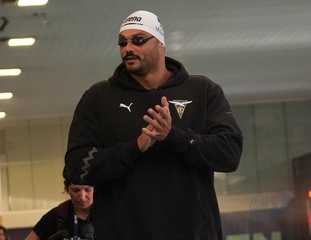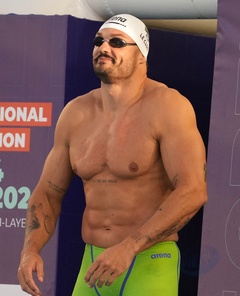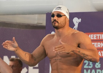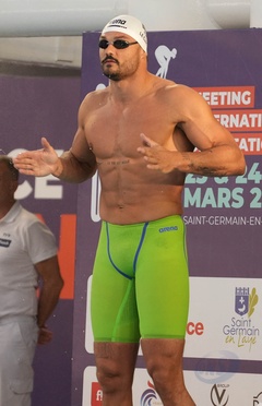 Florent Manaudou podczas zawodów pływackich „Giant Open 2024” na stadionie Dôme w Saint-Germain-en-Laye