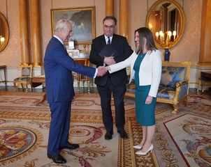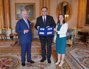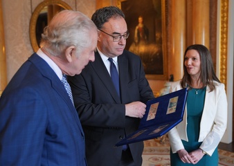 Banknoty z wizerunkiem króla Karola III, które wejdą do obiegu 5 czerwca, przedstawione królowi przez gubernatora Banku Anglii Andrew Baileya w pałacu Buckingham w Londynie. 11