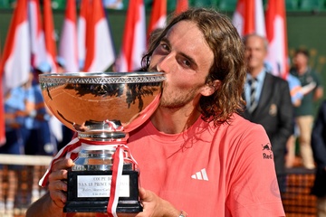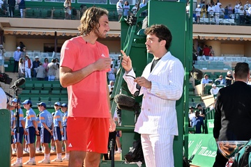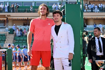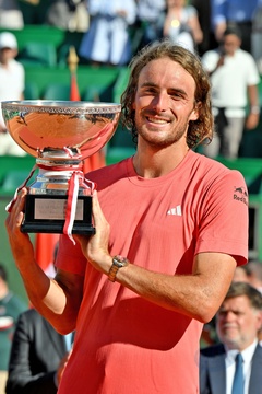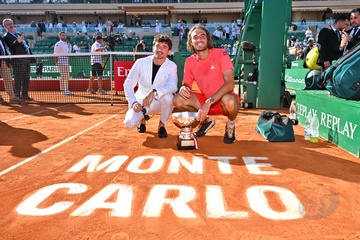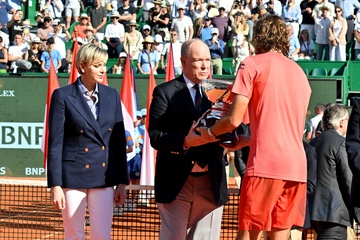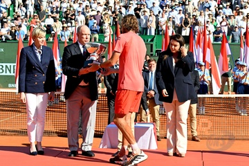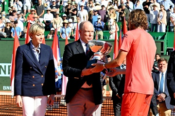 Remise de prix après la finale du tournoi de tennis Masters 1000 de Monte-Carlo à Roquebrune-Cap-Martin (ksiezna Charlene ksiaze Albert Stéfanos Tsitsipas final turnieju tenisowego Masters 1000 w Monte-Carlo w Roquebrune-Cap-Martin)