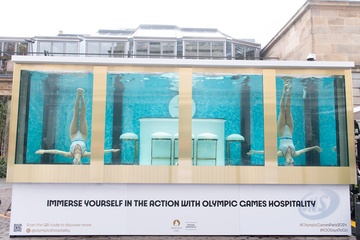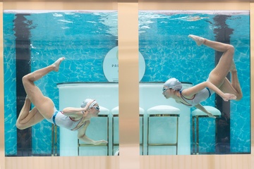 Pływacy synchroniczni promują 100 dni do igrzysk olimpijskich w Paryżu w Covent Garden w Londynie