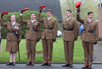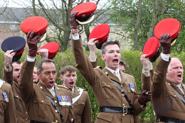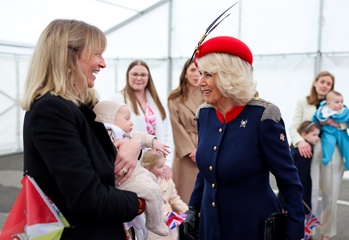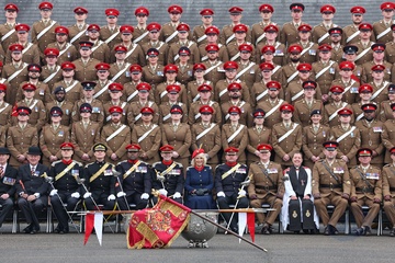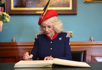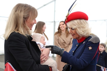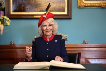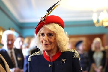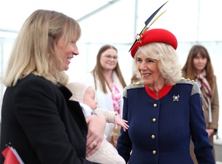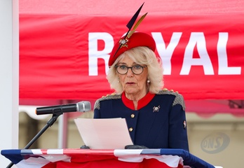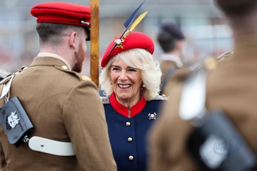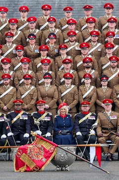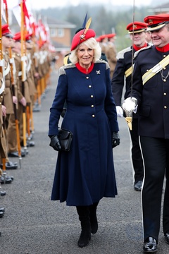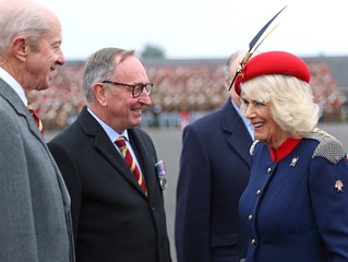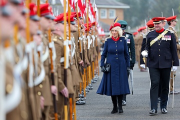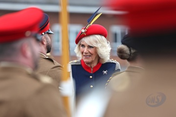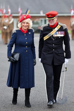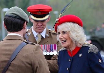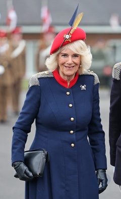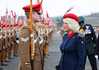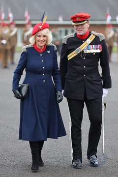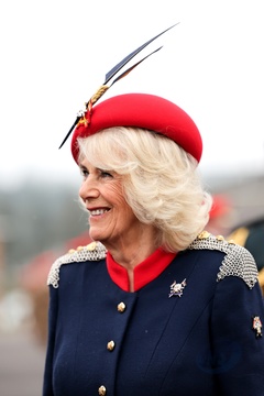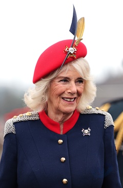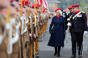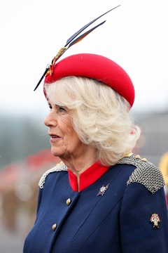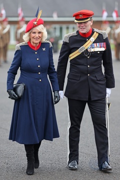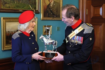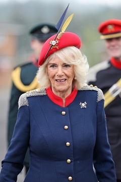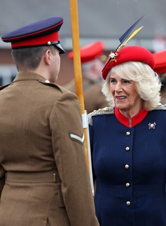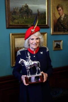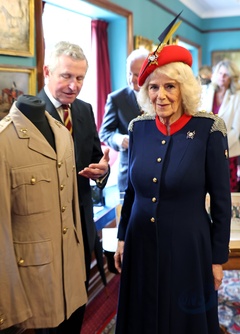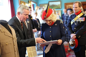 Queen Camilla Visits The Royal Lancers In North Yorkshire (Królowa Camilla ogląda tunikę należącą do jej zmarłego ojca, majora Bruce’a Shanda MC & Bar, który służył w The Royal Lancers podczas II wojny światowej)