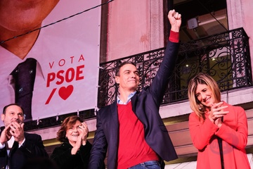 Pedro Sanchez, premier ministre d'Espagne et secrétaire général du PSOE, célèbre la victoire des socialistes aux élections législatives à Madrid