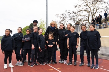 Brigitte Macron assiste au match de charité du Variétés Club de France au profit des Pièces Jaunes à Plaisir (Brigitte Macron)