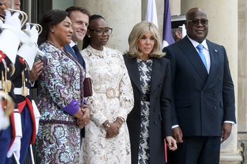 Le président Emmanuel Macron et la Première Dame Brigitte Macron reçoivent son homologue le président de la République démocratique du Congo Félix Tshisekedi et la Première Denise Nyakeru Tshisekedi pour un déjeuner de travail au palais de l'Elysée à (Emmanuel Macron Brigitte Macron)