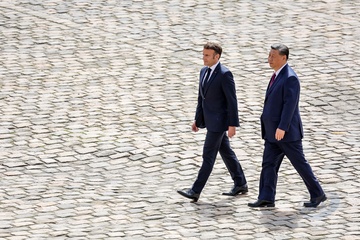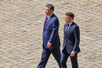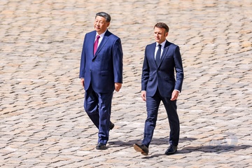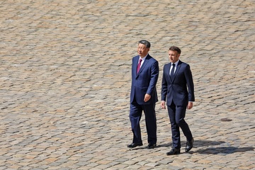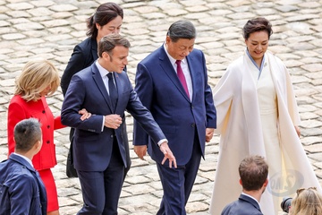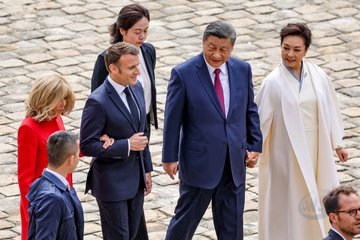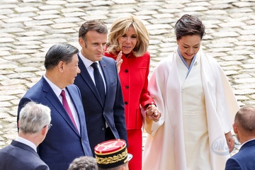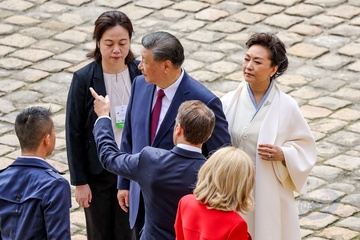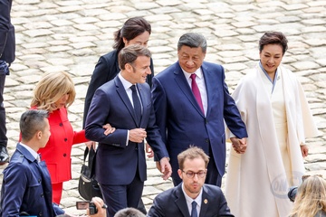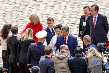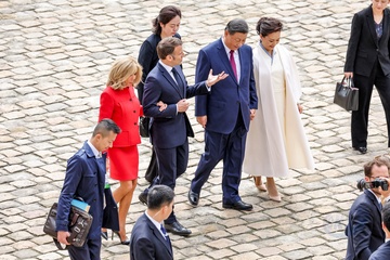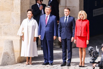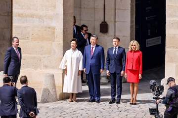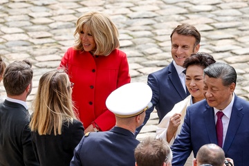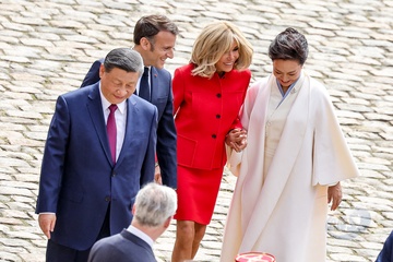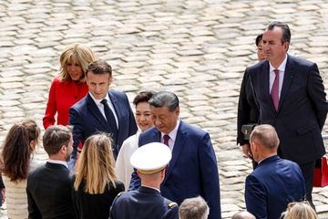 Prezydent Emmanuel Macron, Pierwsza Dama Brigitte Macron, Prezydent Xi Jinping i Pierwsza Dama Peng Liyuan podczas oficjalnej ceremonii powitania w Hôtel National des Invalides w Paryżu 49