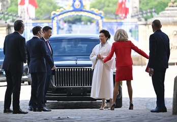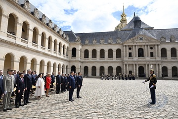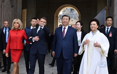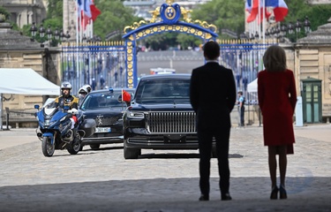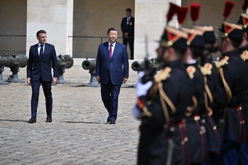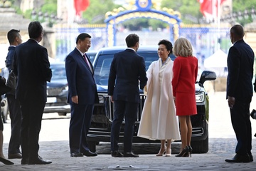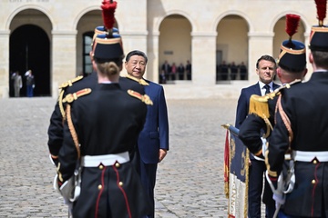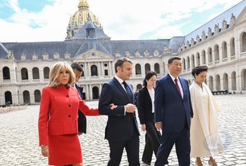 Prezydent Emmanuel Macron, Pierwsza Dama Brigitte Macron, Prezydent Xi Jinping i Pierwsza Dama Peng Liyuan podczas oficjalnej ceremonii powitania w Hôtel National des Invalides w Paryżu 82