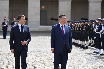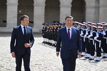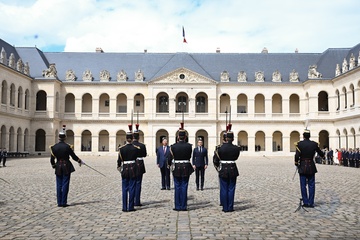 Prezydent Emmanuel Macron, Pierwsza Dama Brigitte Macron, Prezydent Xi Jinping i Pierwsza Dama Peng Liyuan podczas oficjalnej ceremonii powitania w Hôtel National des Invalides w Paryżu