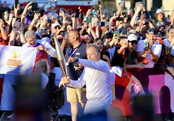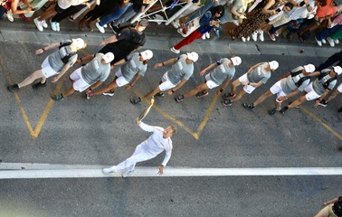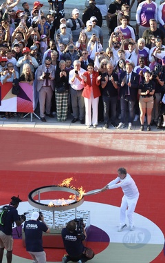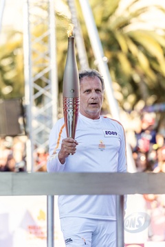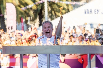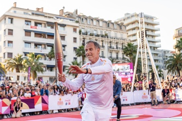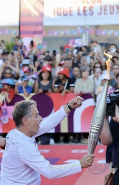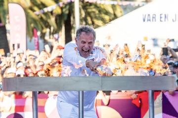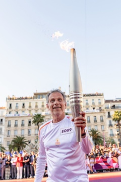 Charles Berling, ostatni niosący znicz olimpijski na Igrzyska Olimpijskie w Paryżu w 2024 r. w Var, zapala kocioł w Tulonie 14