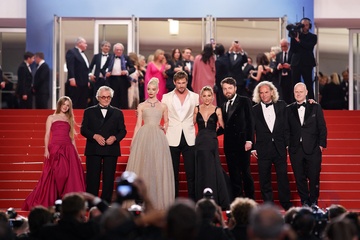 M - Descente des marches du film « Furiosa : A Mad Max Saga » lors du 77ème Festival International du Film de Cannes (Alyla Browne, George Miller, Anya Taylor-Joy, Chris Hemsworth et sa femme Elsa Pataky, Tom Burke, Doug Mitchell, Tom Holkenborg)