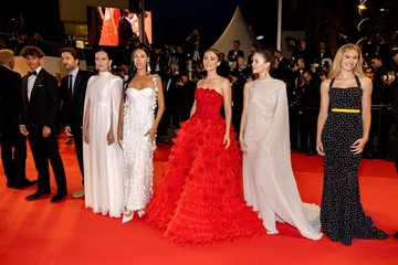 J - Descente des marches du film « Horizon : An american saga » lors du 77ème Festival International du Film de Cannes (Isabelle Fuhrman, Ella Hunt, Georgia MacPhail, Kevin Costner, Alejandro Edda)