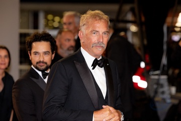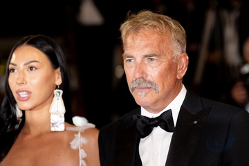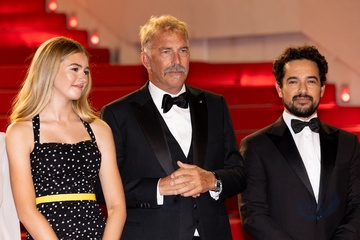 Descente des marches du film « Horizon : An american saga » lors du 77ème Festival International du Film de Cannes (Georgia MacPhail, Kevin Costner, Alejandro Edda)