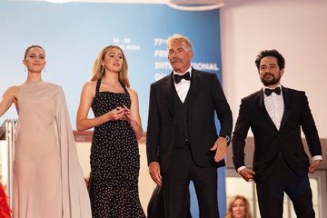 Descente des marches du film « Horizon : An american saga » lors du 77ème Festival International du Film de Cannes (Ella Hunt, Georgia MacPhail, Kevin Costner, Alejandro Edda)