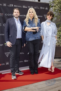 Photocall de la conférence de presse "Filming Italy Sardegna Festival" au pavillon Italien à l'hôtel Majestic en marge du 77ème Festival International du Film de Cannes (Simone Gialdini, Tiziana Rocca et Paz Vega)