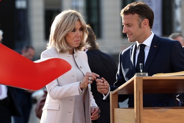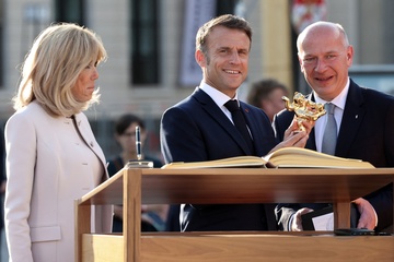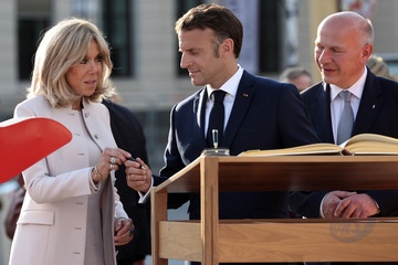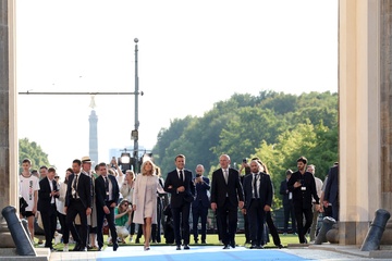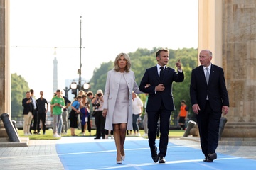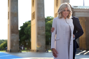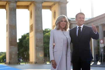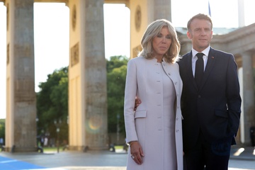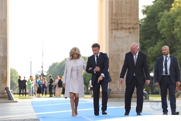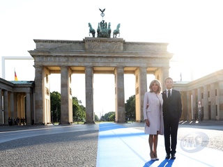 Emmanuel Macron i Brigitte Macron powitani przez burmistrza i gubernatora Berlina przy Bramie Brandenburskiej podczas trzydniowej wizyty państwowej w Niemczech 17