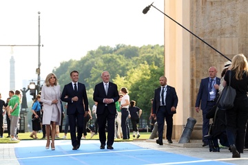 Emmanuel Macron et Brigitte Macron accueilis par le Bourgmestre gouverneur de Berlin à la Porte de Brandebourg, lors une visite d'Etat de trois jours en Allemagne