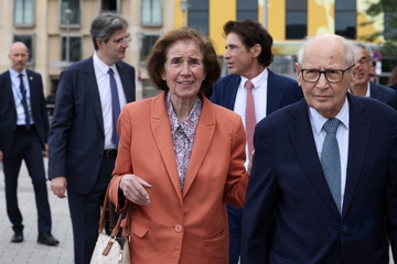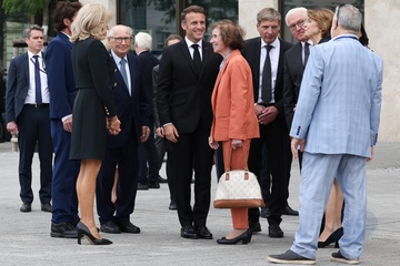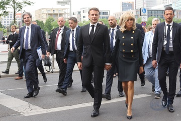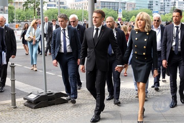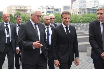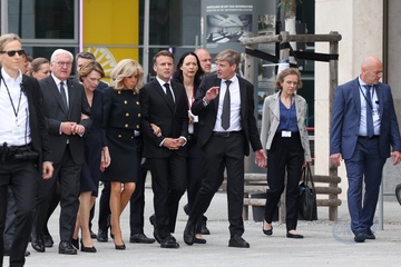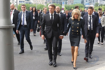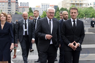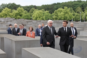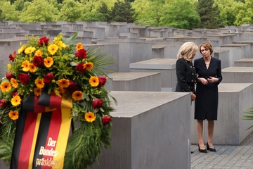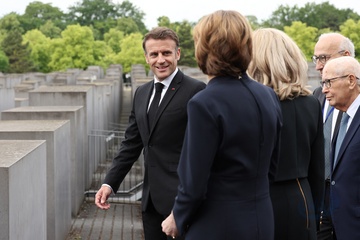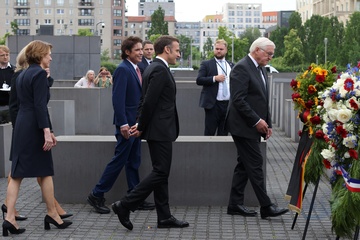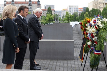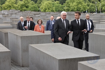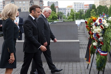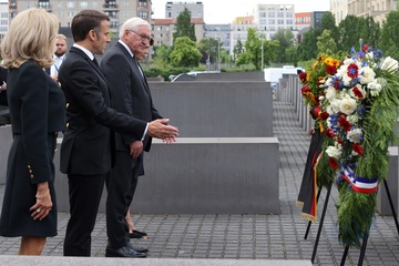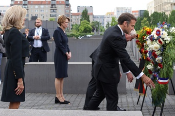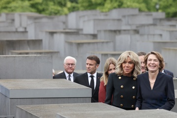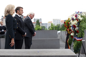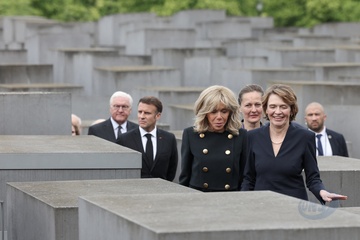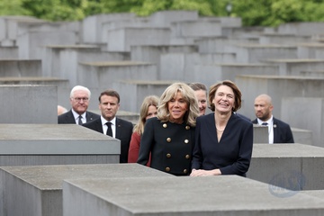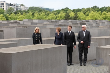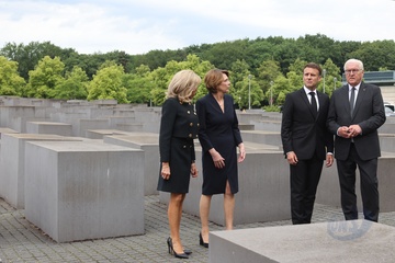 Prezydent Francji Emmanuel Macron i Pierwsza Dama Brigitte Macron, Franck-Walter Steinmeier, Prezydent Republiki Federalnej Niemiec i Pani Elke Budenbender, pod Pomnikiem Holokaustu w Berlinie. 44