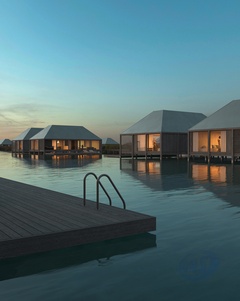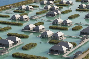 Un complexe touristique disposant de chalets sur pilotis au milieu d'un lagon au Portugal