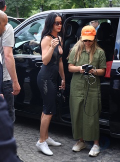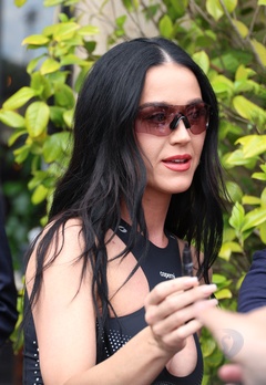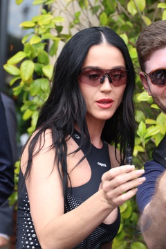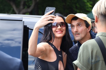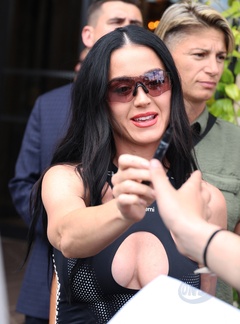 Katy Perry rozdaje autografy i robi sobie selfie z fanami przed swoim hotelem podczas Tygodnia Mody w Paryżu