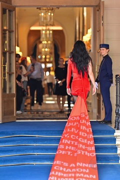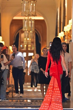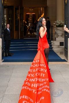 Katy Perry dans une robe avec une longue traîne arrive à l'hôtel Ritz Paris lors de la Fashion Week de Paris