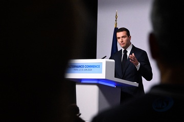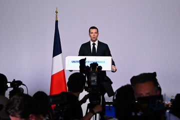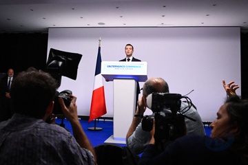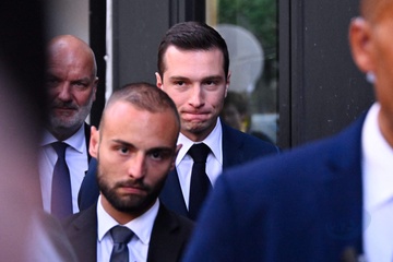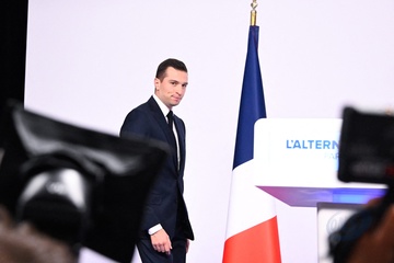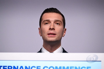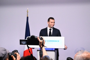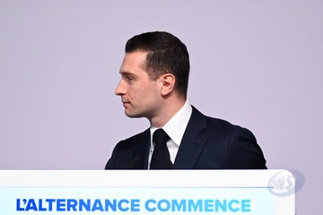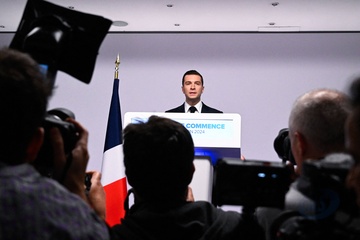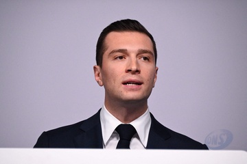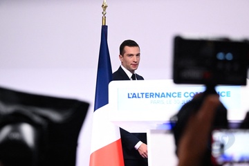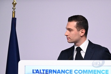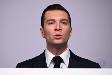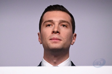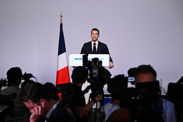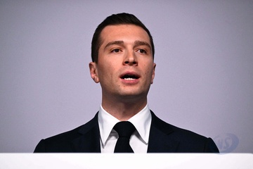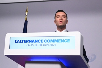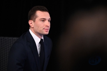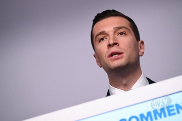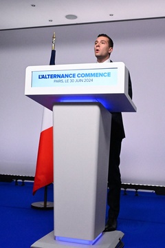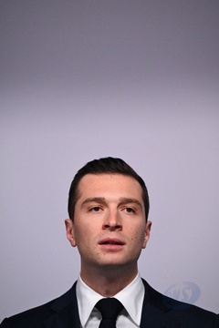 Jordan Bardella wygłasza przemówienie podczas wieczoru wyników pierwszej tury wyborów do organów legislacyjnych w Paryżu