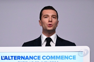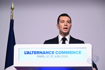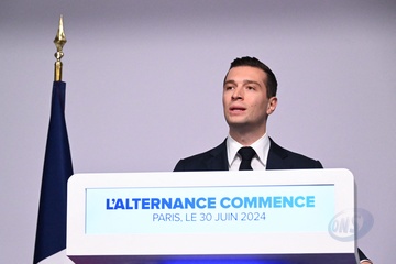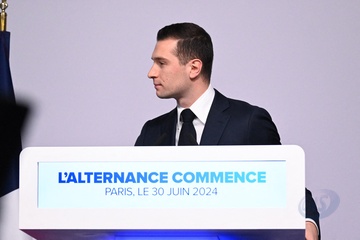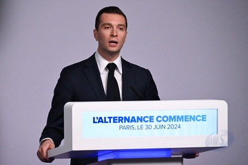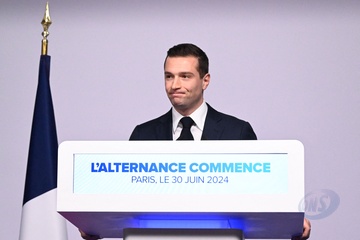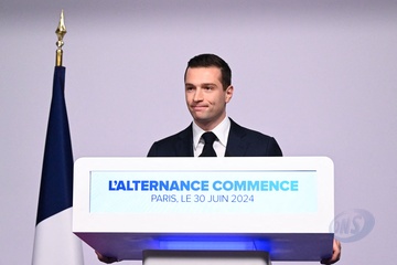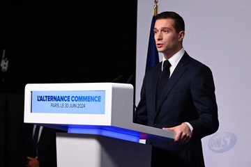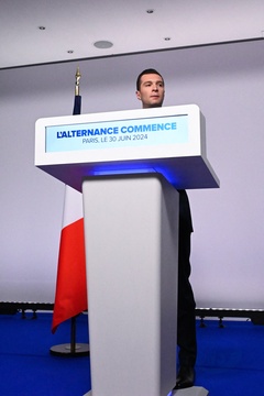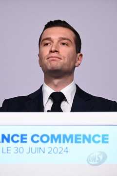 Jordan Bardella, prononce un discours lors de la soirée de résultats du premier tour des élections législatives à Paris
