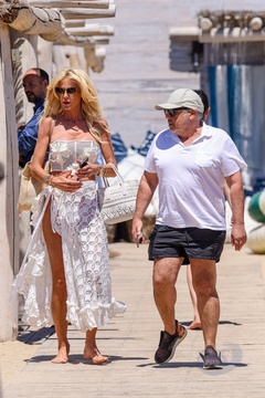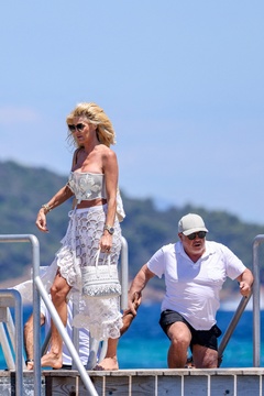 Victoria Silvstedt et son compagnon Maurice Dabbah arrivent sur le célèbre ponton du Club 55 sur la plage de Ramatuelle dans le Golfe de Saint-Tropez