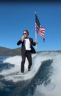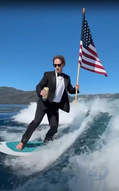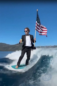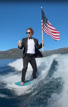 Mark Zuckerberg surfe en costume, une bière et un drapeau américain dans les mains Fesseà l’occasion des festivités du 4 juillet