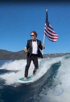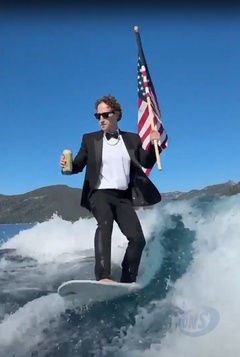 Mark Zuckerberg surfuje w garniturze, z piwem i amerykańską flagą w rękach Fesse podczas uroczystości 4 lipca