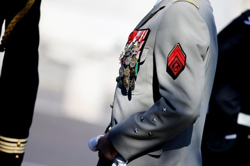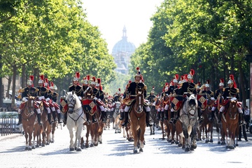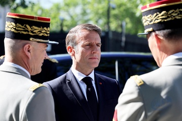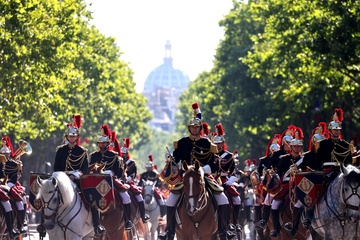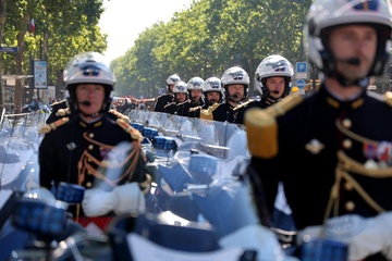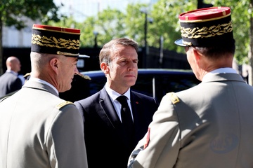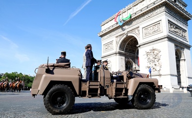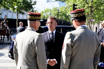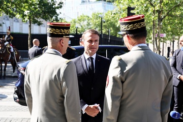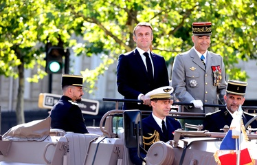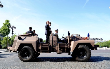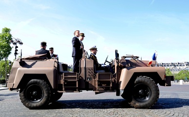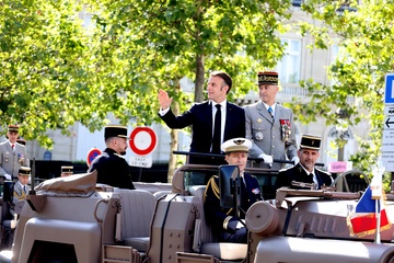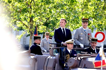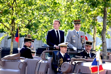 Prezydent Republiki Francuskiej Emmanuel Macron w towarzystwie generała Thierry’ego Burkharda, szefa sztabu sił zbrojnych, na pokładzie „samochodu dowodzenia” podczas ceremonii 144. defilady wojskowej 14 lipca, w Święto Narodowe, w Paryżu 36