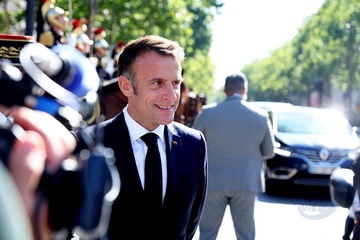 Le président de la République française Emmanuel Macron, accompagné du général Thierry Burkhard, chef d'état-major des armées à bord de la"command car" lors de la cérémonie du 144ème défilé militaire du 14 juillet, jour de la Fête Nationale, à Paris