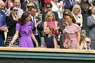 Catherine (Kate) Middleton, princesse de Galles, avec sa fille la princesse Charlotte de Galles, en tribunes au tournoi de tennis de Wimbledon à Londres