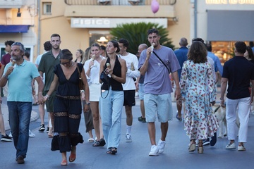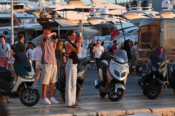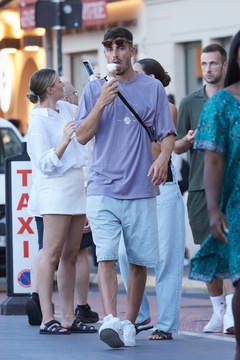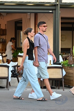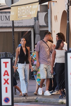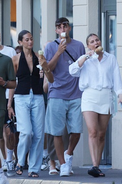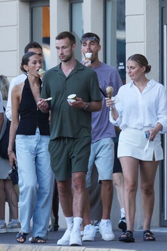 Exclusif - Kai Havertz et sa compagne Sofia Weber mangent une glace en se baladant avec des amis sur le port de Saint-Tropez