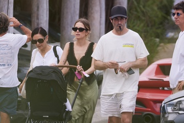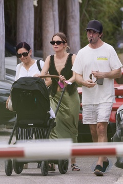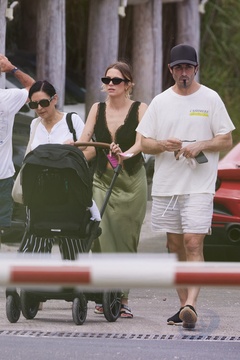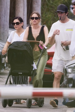 Exclusif - Ashley Benson et son mari Brandon Davis avec leur fille Aspen Davis (en pousstte) à la sortie du Club 55 à Saint-Tropez