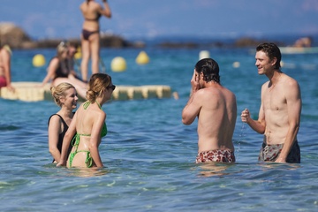 Ashley Benson, jej mąż Brandon Davis, Emma Roberts i jej narzeczony Cody John bawią się jak duże dzieci na plaży podczas wakacji w Zatoce Saint-Tropez 92