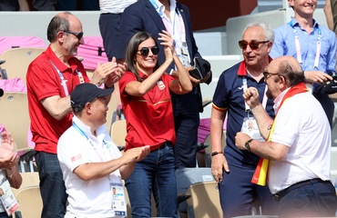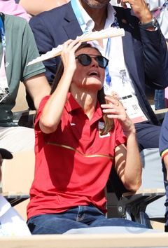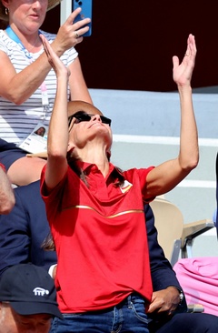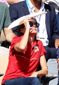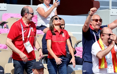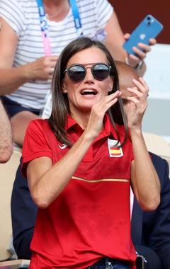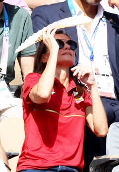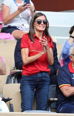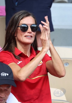 La reine Letizia d’Espagne assiste aux 1/4 de finale de tennis entre Carlos Alcaraz et Tommy Paul lors des Jeux Olympiques de Paris2024 (JO) à Roland Garros