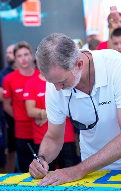 Król Hiszpanii Felipe VI podpisuje ukraińskie flagi dzieciom w Plama Yacht Club na Majorce przed Copa del Rey