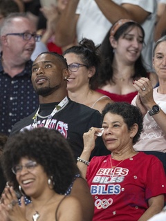 Simone Biles devant son compagnon Jonathan Owens et ses parents Nellie Biles et Ronald Biles lors des épreuves de Gymnastique artistique féminine, finale du concours général lors des Jeux Olympiques de Paris 2024 (JO)