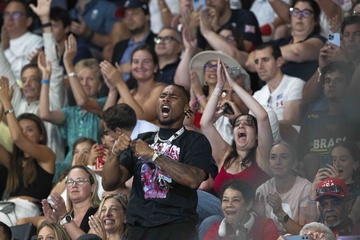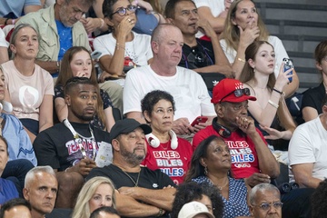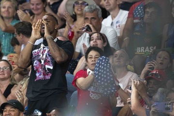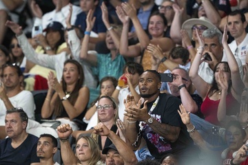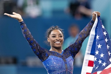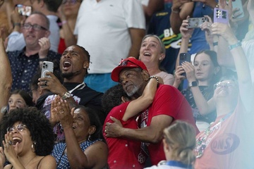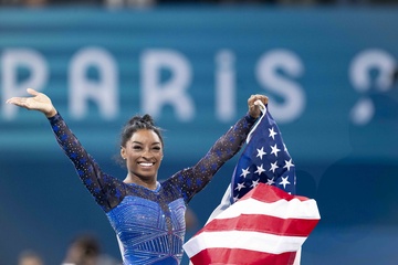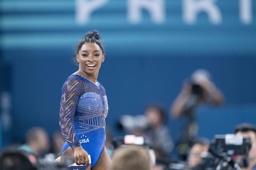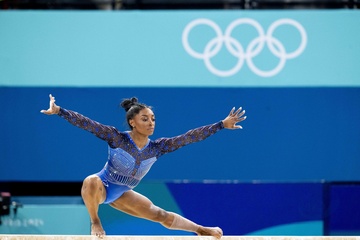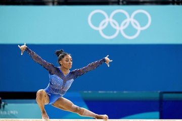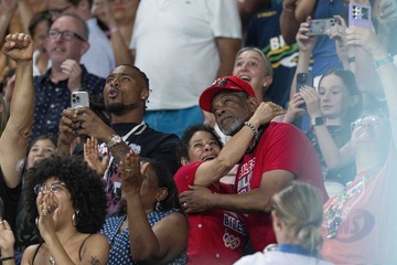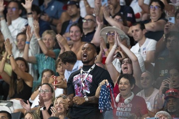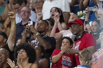Simone Biles przed swoim towarzyszem Jonathanem Owensem oraz jej rodzicami Nellie Biles i Ronaldem Bilesem podczas zawodów gimnastyki artystycznej kobiet, wszechstronnego finału podczas Igrzysk Olimpijskich w Paryżu w 2024 r. 32
