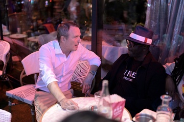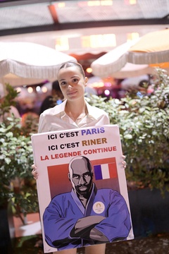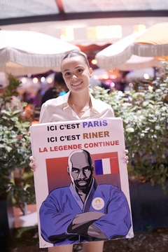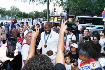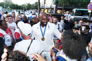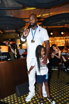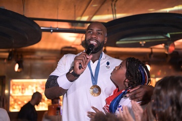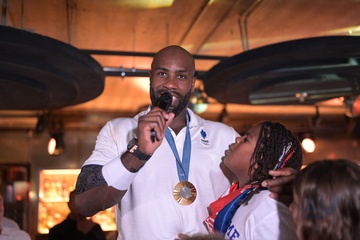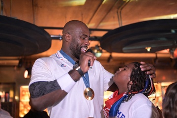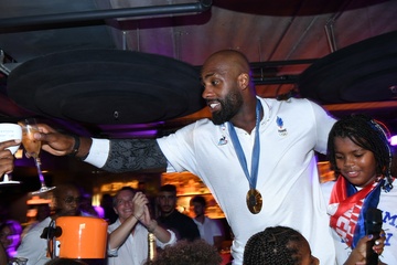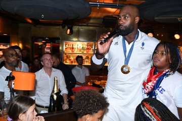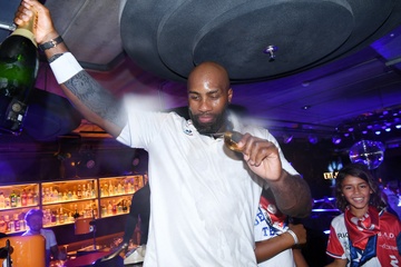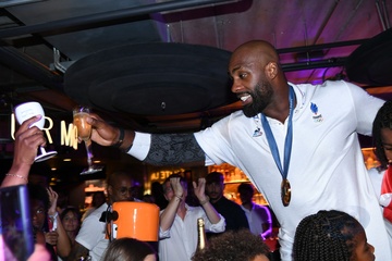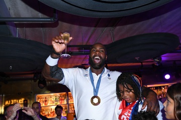 Teddy Riner świętuje swój tytuł mistrza olimpijskiego w judo +100 kg w należącej do grupy restauracji „Podium” (Les bistrots Pas Parisiens) w Paryżu. 75
