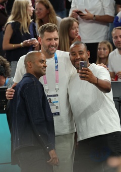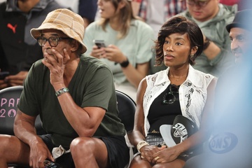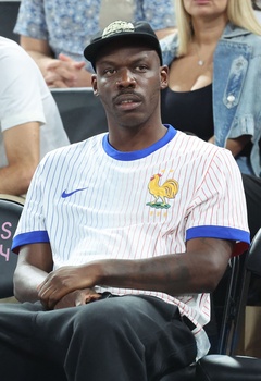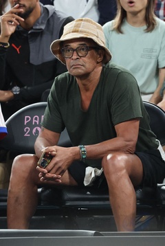 Gwiazdy na trybunach podczas półfinałowego turnieju koszykówki pomiędzy Francją a Niemcami podczas Igrzysk Olimpijskich w Paryżu w 2024 r. (OG) w Bercy Arena. 16