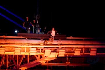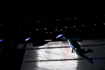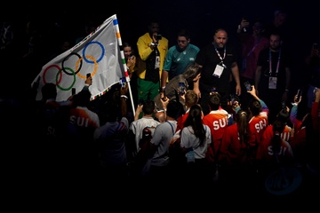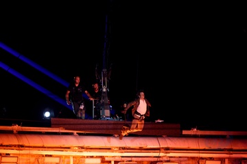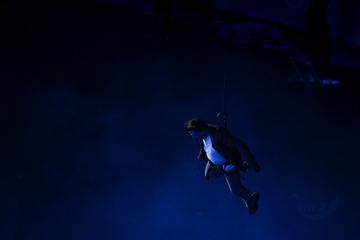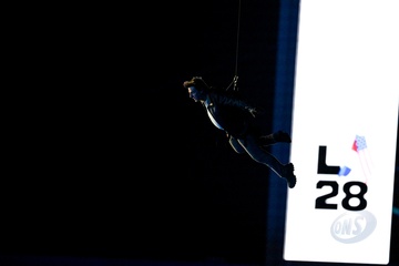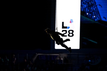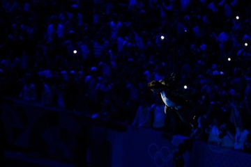 Tom Cruise, accroché à un fil, descend du toit du stade de France pour prendre le drapeau olympique