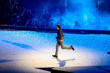 Tom Cruise wiszący na włosku schodzi z dachu Stade de France, aby odebrać flagę olimpijską